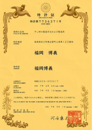 百市農園代表、福岡博義が2025年9月1日に 「特許第7736371号 干し柿の製造方法及び製造具」を取得いたしました。